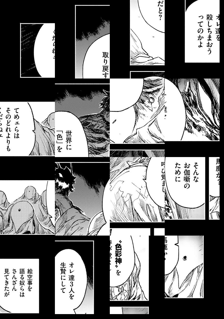極大太陽フレアの影響で世界から色素が失われ、 異形化が進んだ人類。世界に「色」を 取り戻すべく研究を進めるアヴィディアと、 「色」が持つ巨大なエネルギーを利用して 世界統一を目論む「教団」との壮絶な闘いが始まる!!