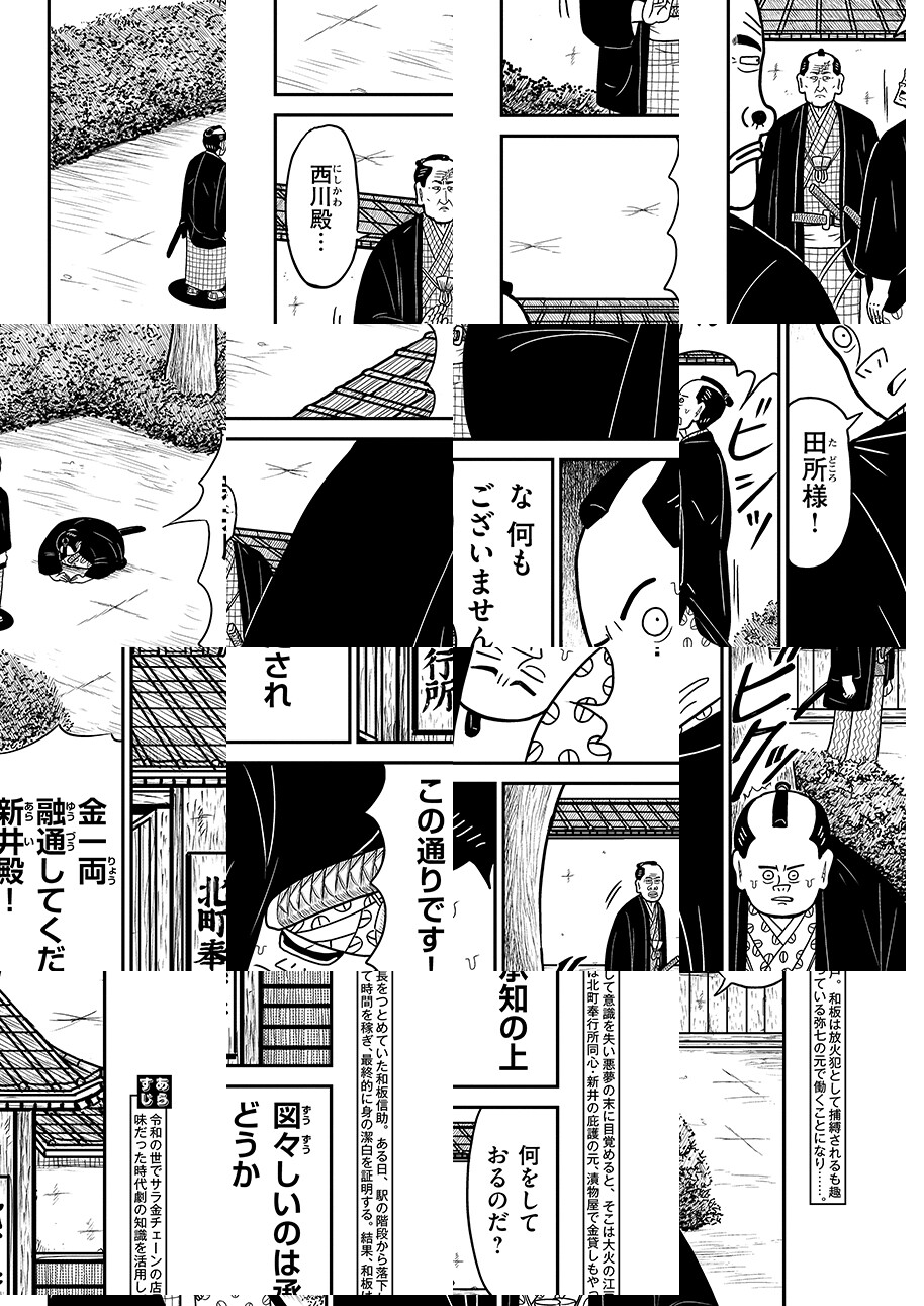 令和の世でサラ金チェーンの店長をつとめていた和板信助。ある日、駅の階段から落下して意識を失い悪夢の末に目覚めると、そこは大火の江戸。和板は放火犯として捕縛されるも趣味だった時代劇の知識を活用して時間を稼ぎ、身の潔白を証明しようとするが……。
