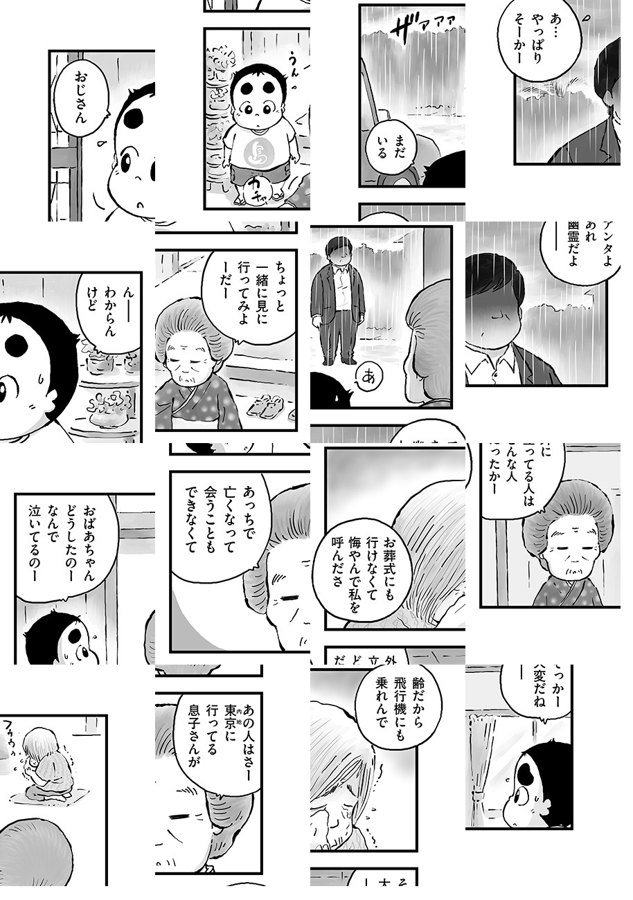 ユタの祖母を持つ、芸人であり新進気鋭の怪談師でもある「ヤースー」の多感な霊感少年時代を『クロ號』『猫なんかよんでもこない。』『漁港の肉子ちゃん』等で知られる「杉作」が優しく、恐く、アットホームに描く!!
